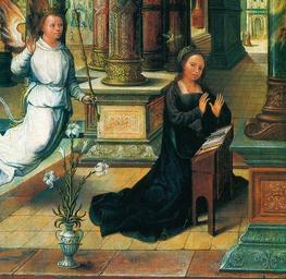 Keywords: Antwerp Annunciation (detail).jpg Antwerp Annunciation ca 1525 oil leather wood Institution Porczyński Gallery accession number object history credit line Danuta Rago Maria Raczyńska 1988 Kolekcja imienia Jana Pawła II z fundacji Janiny i Zbigniewa Karola Porczyńskich Krajowa Agencja Wydawnicza p 41 PD-old-100 DEFAULTSORT 1525 circa; Annunciation Details of paintings in the Porczyński Gallery Early Netherlandish paintings of Annunciation 1520s paintings in Poland 16th-century religious paintings in Poland 16th-century oil on panel paintings in Poland Leather art Paintings of Annunciation in Poland |