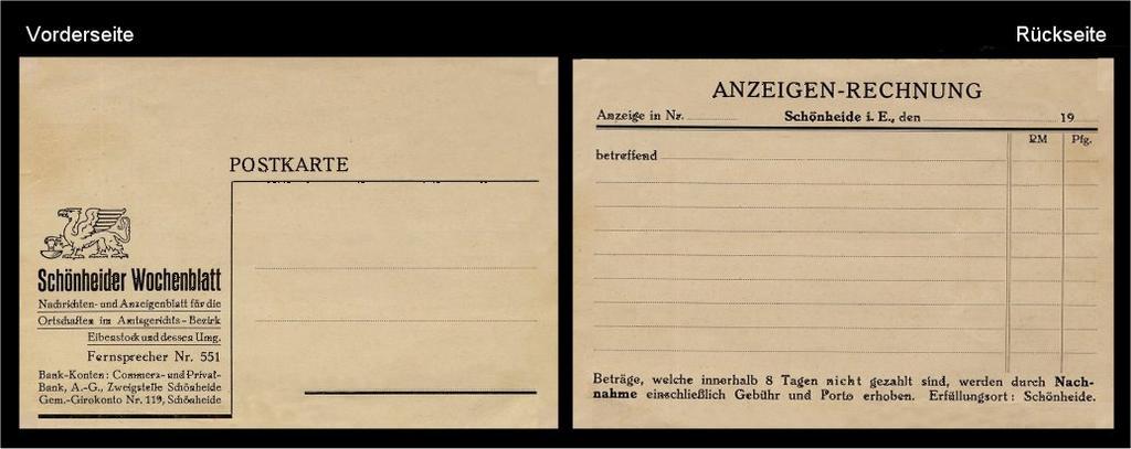 Keywords: Anzeigenrechnung SW( historisch).jpg de Auf solchen Postkarten stellte der Druckereibesitzer und Herausgeber des Schönheider Wochenblatt es R Sattler seinen Kunden dort veröffentlichte Anzeigen in Rechnung Scan Wewalther 2013-09-09 Historical documents of Schönheide Cc-zero |