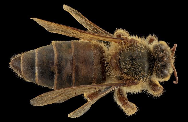 | Keywords: bug bugs bee bees pollinator pollinators animal animals animalia arthropod arthropods arthropoda insect insects insecta hymenoptera aculeata anthophila apoidea apidae apinae apini apis honeybee honeybees biml queen usgs droege apis mellifera apismellifera taxonomy:binomial=apis mellifera taxonomy:binomial=apismellifera maryland honey hive usgsbiml black background organic pattern pattern outdoor photo border monochrome Queen Bee photo spread. Collected by Tim McMahon from a colony in Talbot County, while slightly gummy as Honeybees are want to be, this series shows the longer abdomen, the odd curly dark hairs on top of the head and the broad hind tibia, but lacking the hairs and pollen basket that the workers have. Queen Bee photo spread. Collected by Tim McMahon from a colony in Talbot County, while slightly gummy as Honeybees are want to be, this series shows the longer abdomen, the odd curly dark hairs on top of the head and the broad hind tibia, but lacking the hairs and pollen basket that the workers have. |