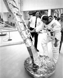 Keywords: neil armstrong neilarmstrong apollo 11 apollo11 blackandwhite monochrome black and white "KSC, FL -- With a foot on one of the four landing pads, Apollo 11 CDR Neil A. Armstrong descends ladder of LM training spacecraft. While he and Edwin E. Aldrin, Jr., explore the Moon's surface, Michael Collins will pilot the CSM in lunar orbit. NASA directs the Apollo program." -- caption for NASA photo No. KSC-69P-578 (aka 69-H-1086), release date July 10, 1969. "KSC, FL -- With a foot on one of the four landing pads, Apollo 11 CDR Neil A. Armstrong descends ladder of LM training spacecraft. While he and Edwin E. Aldrin, Jr., explore the Moon's surface, Michael Collins will pilot the CSM in lunar orbit. NASA directs the Apollo program." -- caption for NASA photo No. KSC-69P-578 (aka 69-H-1086), release date July 10, 1969. |