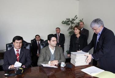 Keywords: Presidente Valdir Rossoni (PSDB) e 1º secretário Plauto Miro (DEM) divulgam relatório sobre irregularidades nas aposenatorias da Assembleia. Foto: Nani Gois (crédito obrigatório)