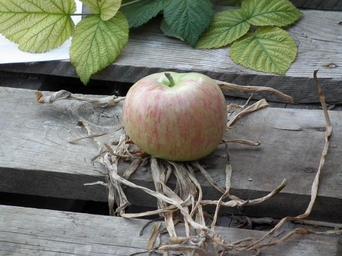 Keywords: apple fruit ripe green tree garden grass sheet fresh greens countryside summer day outdoors dry wooden board