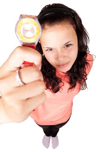 Keywords: appointment clock countdown deadline delay hands late object point time watch pointing woman girl young angry