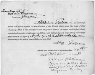 | Keywords: Appointment and Oath of Office for William Gilson as Deputy Marshal in the Territory of Arizona. - NARA - 295725.tif  Scope and content General notes 295725 Local identifier NARA's Pacific Region Riverside NRHAR 23123 Cajalco Rd Perris CA 92570 1878-10-10 Record group Record Group 527 Records of the U S Marshals Service 1864 - 1992 Record group ARC 764 Appointments and Oaths of U S Marshals and Deputy Marshals compiled 1864 - 1912 Series ARC 295651 File unit File unit ARC Variant control numbers NAIL Control Number NRHL-527-AZ1-74 yes Other versions NARA-cooperation PD-USGov Documents in English |