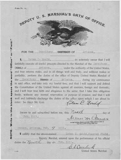 | Keywords: Appointment and Oath of Office for Lotan E. Gould as Deputy Marshal in the Territory of Arizona. - NARA - 295728.tif  Scope and content General notes 295728 Local identifier NARA's Pacific Region Riverside NRHAR 23123 Cajalco Rd Perris CA 92570 1911-02-09 Record group Record Group 527 Records of the U S Marshals Service 1864 - 1992 Record group ARC 764 Appointments and Oaths of U S Marshals and Deputy Marshals compiled 1864 - 1912 Series ARC 295651 File unit File unit ARC Variant control numbers NAIL Control Number NRHL-527-AZ1-77 yes Other versions NARA-cooperation PD-USGov Check categories-NARA 2011 September 13 Documents in English |
