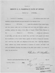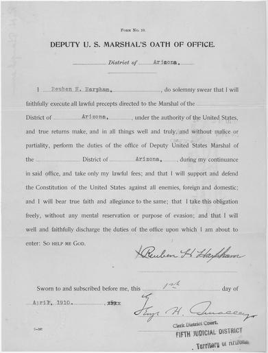 | Keywords: Appointment and Oath of Office for Rueben H. Harpham as Deputy Marshal in the Territory of Arizona. - NARA - 295738.tif  Scope and content General notes 295738 Local identifier NARA's Pacific Region Riverside NRHAR 23123 Cajalco Rd Perris CA 92570 1910-04-01 Record group Record Group 527 Records of the U S Marshals Service 1864 - 1992 Record group ARC 764 Appointments and Oaths of U S Marshals and Deputy Marshals compiled 1864 - 1912 Series ARC 295651 File unit File unit ARC Variant control numbers NAIL Control Number NRHL-527-AZ1-87 yes Other versions NARA-cooperation PD-USGov Check categories-NARA 2011 September 13 Documents in English |