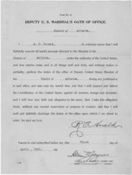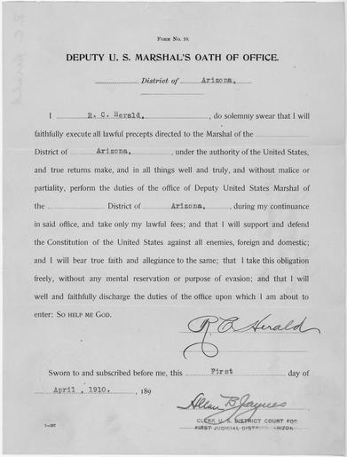 | Keywords: Appointment and Oath of Office for R. C. Herald as Deputy Marshal in the Territory of Arizona. - NARA - 295748.tif  Scope and content General notes 295748 Local identifier NARA's Pacific Region Riverside NRHAR 23123 Cajalco Rd Perris CA 92570 1910-04-01 Record group Record Group 527 Records of the U S Marshals Service 1864 - 1992 Record group ARC 764 Appointments and Oaths of U S Marshals and Deputy Marshals compiled 1864 - 1912 Series ARC 295651 File unit File unit ARC Variant control numbers NAIL Control Number NRHL-527-AZ1-97 yes Other versions NARA-cooperation PD-USGov Check categories-NARA 2011 September 13 Documents in English |