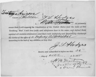 | Keywords: Appointment and Oath of Office for J. L. Hodges as Deputy Marshal in the Territory of Arizona. - NARA - 295755.tif  Scope and content General notes 295755 Local identifier NARA's Pacific Region Riverside NRHAR 23123 Cajalco Rd Perris CA 92570 1878-10-26 Record group Record Group 527 Records of the U S Marshals Service 1864 - 1992 Record group ARC 764 Appointments and Oaths of U S Marshals and Deputy Marshals compiled 1864 - 1912 Series ARC 295651 File unit File unit ARC Variant control numbers NAIL Control Number NRHL-527-AZ1-104 yes Other versions NARA-cooperation PD-USGov Check categories-NARA 2011 September 13 Documents in English |