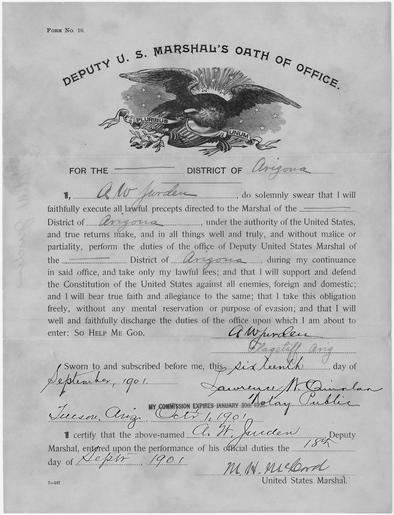 | Keywords: Appointment and Oath of Office for A. W. Jurden as Deputy Marshal in the Territory of Arizona. - NARA - 295770.tif Scope and content General notes 295770 Local identifier NARA's Pacific Region Riverside NRHAR 23123 Cajalco Rd Perris CA 92570 1901-09-18 Record group Record Group 527 Records of the U S Marshals Service 1864 - 1992 Record group ARC 764 Appointments and Oaths of U S Marshals and Deputy Marshals compiled 1864 - 1912 Series ARC 295651 File unit File unit ARC Variant control numbers NAIL Control Number NRHL-527-AZ1-119 yes Other versions NARA-cooperation PD-USGov Appointment and Oath of Office documentation for Arizona Deputy Marshalls 1901 texts Documents in English |