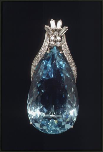 Keywords: Aquamarine, platinum, and diamond brooch-pendant - NARA - 192417.tif Scope and content This brooch is made of a tear drop-shaped very fine aquamarine held in the setting of a platinum wire with two pins and loops for hanging as a pendant The narrow end of the setting has five brilliant cut diamonds in a group and four baguette diamonds set at angles On either side a ribbon of white gold set with nine diamonds curves to the back of the setting The brooch was worn by Mrs Lyndon B Johnson during the presidency of her husband and was a gift to her from His Excellency Artur da Costa e Silva President-elect of Brazil General notes The brooch measures 2 x 15/16 192417 Local identifier National Archives and Records Administration Office of Presidential Libraries Lyndon B Johnson Library and Museum 04/01/1985 - Lyndon Baines Johnson Library NLLBJ 2313 Red River Street Austin TX 78705-5702 1967-01-31 Record group Collection LBJ-MCOLL Lyndon B Johnson Museum Collection 11/22/1963 - 07/09/1998 Record group ARC 1151 Artifacts Relating to the Life and Presidency of Lyndon B Johnson compiled 11/22/1963 - 07/09/1998 Series ARC 192413 File unit File unit ARC Variant control numbers NAIL Control Number NLJ-MCOLL-A-M04<br /> Other Identifier 67 4 1 yes Other versions NARA-cooperation PD-USGov Aquamarine jewellery Jewellery of Brazil Lady Bird Johnson Lyndon Baines Johnson Library and Museum White gold jewellery Gifts of heads of state Artur da Costa e Silva |