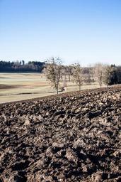 Keywords: arable plowed earth plaice landscape upper bavaria spring trees poplars blue sky nature forest field agriculture evening light clear sunny beautiful