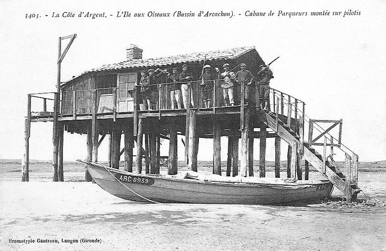 | Keywords: Arcachon cabane sur pilotis.jpg en Oyster farmer's hut built on piles at La Côte d'Argent Ile aux Oiseaux Bassin d'Arcachon A wooden building with a roof of half-round tiles fr Cabane de parqueurs d'huitres montée sur pilotis à la Côte d'Argent sur l'Ile aux Oiseaux Bassin d'Arcachon Bâtiment en bois sous un toit de tuiles canal Own Auteur inconnu / Unknown author Début XXe siècle / Early XXth century Aucune / None PD-old Cabane tchanquée Pilotis Postcards of Gironde | ||||