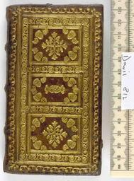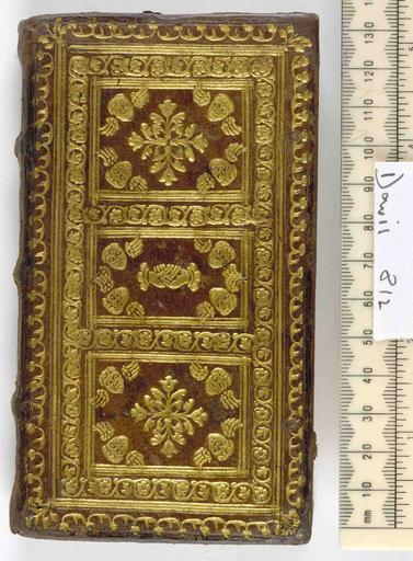 Keywords: Arcadia -and- Le Rime - Upper cover (Davis812).jpg Style Cherubs head Hand motif; Caption Upper cover; Colour Brown; Edge Gilt gauffered exhibition history Decorative Technique Tooled in gold; Cover Material Goatskin includes morocco turkey etc Macchi states; Venetian style c1553 Bought at Librairie ancienne Ulrico Hoepli Milan Bibliothèque Joseph Martini deuxième partie p 82 n 176 object history Text 1553; Venice; Unspecified object type Cc-zero place of creation Binding Italy place of discovery M M Foot The Henry Davis Gift Vol III London 2010 British Library image http //www bl uk/catalogues/bookbindings/LargeImage aspx RecordId 020-000004988 ImageId ImageId 42099 Copyright BL Arcadia and Le Rime Uploaded with GWToolset Arcadia and Le Rime - Upper cover Davis812 http //www webarchive org uk/bldatasets/bindings/6676_4 jpg Gilded books 16th-century bookbinding British Library Bookbindings |