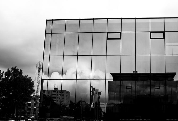 Keywords: architecture building heaven modern gray czech budejovice glass reflection black and white