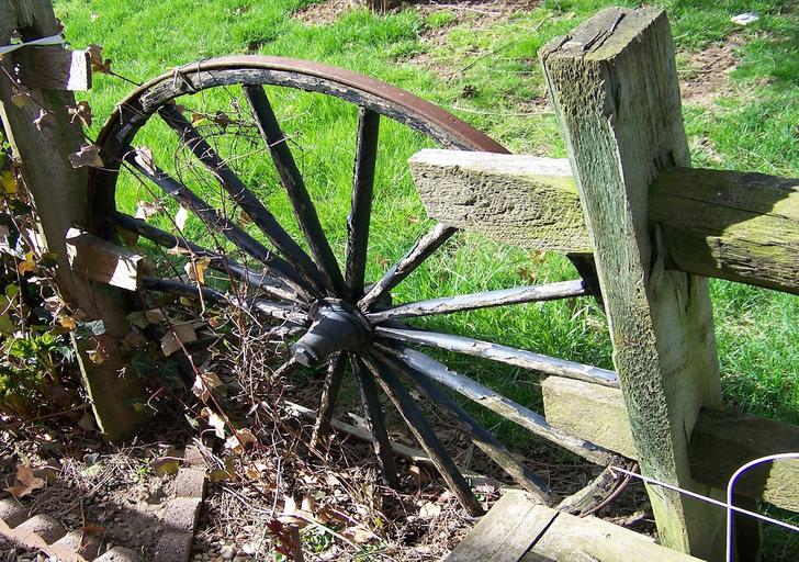 Keywords: architecture landscape still life wheel wood old wagon fence garden