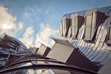 Keywords: architecture modern building skyscraper facade art abstract surreal düsseldorf media harbour metal gehry low angle shot sky clouds window