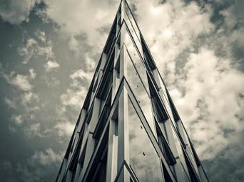 Keywords: architecture modern building skyscraper facade düsseldorf low angle shot mirroring abstract black white