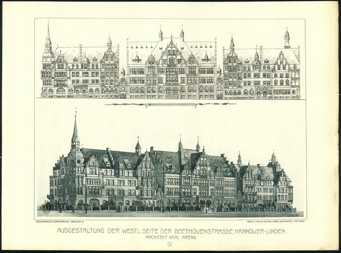 | Keywords: Architektonische Charakterbilder, Jahrgang 3, Tafel 051, Ausgestaltung der westl. Seite der Beethovenstrasse, Hannover-Linden, Architekt Karl Arend (Carl Arend).jpg Die Tafel 51 im III Jahrgang 1902 der Architektonischen Charakterbilder mit einer Architektur-Skizze und einer -Zeichnung unter dem Titel Ausgestaltung der westl Seite der Beethovenstrasse Hannover-Linden Die dann tatsächlich erfolgte Bebauung insbesondere die durch den leitenden Architekten Georg Fröhlich mit Alfred Sasse bis 1901 errichtete Humboldtschule heute Oberstufe der IGS Linden folgte anderen Plänen Wenngleich der Urheber der Zeichnungen dieser Tafel hier mit C Arend signiert hat unten rechts wird der Architekt im Untertitel abweichend mit Karl Arend angegeben Dieses Blatt wurde aufgrund seiner Größe > DIN A3 in zwei Teilen jeweils mit 600 dpi eingescannt und dann mit einem Fotobearbeitungs-Programm wieder zusammengefügt Dabei hat sich gezeigt daß ein Scan mit 600 dpi je nach Scanner offensichtlich unterschiedlich gute Resultate bringt Wir danken für die technische und personelle Unterstützung durch die Angestellten der Firma CopyStork in Hannover Körnerstraße 3 Das originale Blatt wurde dankenswerterweise von Johannes Rappenecker zur Verfügung gestellt um es als Digitalisat über Wikimedia Commons nachhaltig allen Menschen dieser Welt zugänglich zu machen Scan vom Original Bernd Schwabe mit Dank an den Stifter Johannes Rappenecker 1900 Zeichnung 1902 Druck Carl Arend <gallery> File Beethovenstrasse Hannover-Linden Carl Arend Architekt Architektonische Charakterbilder Jahrgang 3 Tafel 051 Skizze der so nicht zur Ausführung gekommen westlichen Seite mit der Humboldtschule heute IGS Linden jpg Obere Hälfte der Tafel </gallery> PD-old Documents by Johannes Rappenecker Architektonische Charakterbilder Beethovenstraße Hannover Carl Arend architect 1900 works in Hannover Alte Humboldtschule Linden |