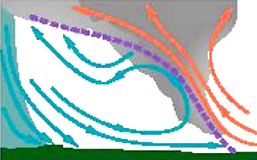 Keywords: Arcus shelf cloud diagram.png fr Flux sortant d'un orage en bleu dans la goutte froide et flux entrant venant de l'environnement en orage L'air plus dense de la goutte force l'air ambiant à être soulevé ce qui le refoidit et la condensation de l'humidité donne l'arcus à la base de l'orage en Cold air descending from a cumulonimbus in blue meet the warm and moist environmental air Since the cold pool is denser the moist air is forced upward and the humidity condense into a shelf cloud a variety of arcus cloud own Pierre cb 2008-06-24 Shelf cloud |