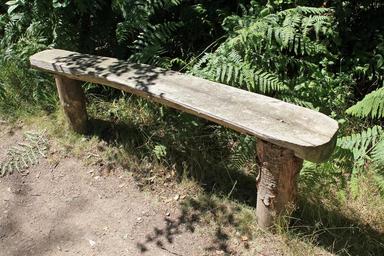 Keywords: area bench forest green lonely path pathway quiet relax rest seasonal seat seated seating still stool stop stump summer track trail tree vacant wooded wooden woodlands woods