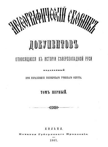 | Keywords: Arheograficheskij sbornik dokumentov k istorii Severo-Zapadnoj Rusi - T 1 - Wilno 1867 AD.JPG en title page of book А хеог афический сбо ник документов относящихся к исто ии Севе о-Западной Руси T 1 Wilno city 1867 AD ru обложка книги А хеог афический сбо ник документов относящихся к исто ии Севе о-Западной Руси T 1 Вильно 1867 г be вокладка кнігі А хеог афический сбо ник документов относящихся к исто ии Севе о-Западной Руси T 1 Вільня 1867 г reproduction from title page of А хеог афический сбо ник документов к исто ии Севе о-Западной Руси T 1 Wilno city 1867 AD office of Vilno educational district Russian empire 1867 public domain free Виленский учебный ок уг Севе о-Западный к ай севе о-западные губе нии Севе о-Западная Русь Віленская навучальная ак уга Паўночна-заходні к ай Паўночна-Заходняя Русь паўночна-заходнія губе ні Віленская а хеаг афічная камісія Northwestern Krai PD-old |