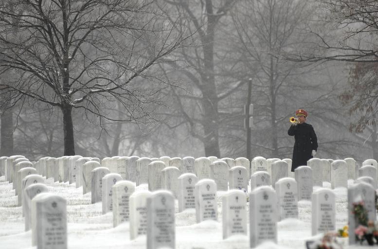 Keywords: arlington national cemetery washington dc bugler taps memorial winter snow ice trees nature outside somber resting place graves memory