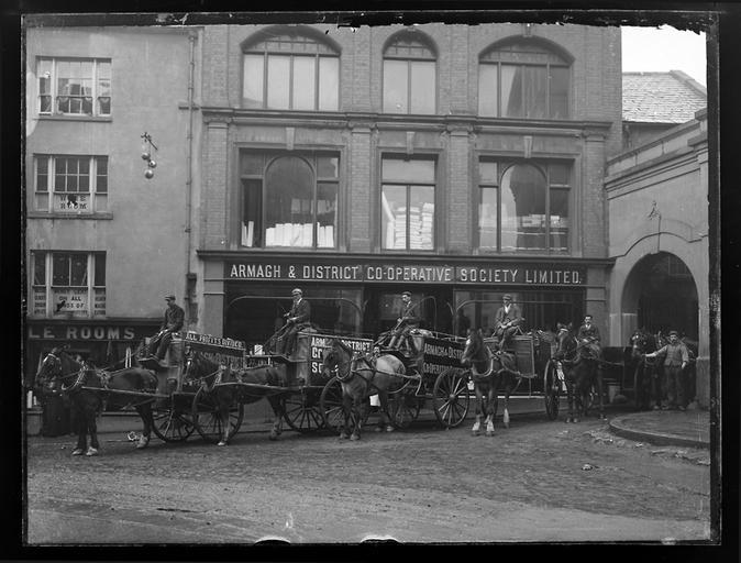 Keywords: cooperative stores cooperativestores co-op coop proni allison allison & co. photographers allisoncophotographers businesses business work services genealogy ancestry ulster armagh northern ireland northernireland blackandwhite monochrome photo border outdoor black and white Creator: H. Allison & Co. Photographers Date: c.1905 Original Format: Glass Plate Negative Description: Armagh and District Cooperative Society Ltd. Building with six shop carts, horses and drivers in front. PRONI Ref: D2886/W/Portrait/14 Copying and copyright: Please see www.proni.gov.uk/index/research_and_records_held/copying_... For Copy Orders, contact: Email: proni@dcalni.gov.uk For fees and charges see: www.proni.gov.uk/index/about_proni/are_there_any_fees_and... Creator: H. Allison & Co. Photographers Date: c.1905 Original Format: Glass Plate Negative Description: Armagh and District Cooperative Society Ltd. Building with six shop carts, horses and drivers in front. PRONI Ref: D2886/W/Portrait/14 Copying and copyright: Please see www.proni.gov.uk/index/research_and_records_held/copying_... For Copy Orders, contact: Email: proni@dcalni.gov.uk For fees and charges see: www.proni.gov.uk/index/about_proni/are_there_any_fees_and... |