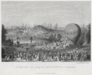 Keywords: Armand-Joseph Lallemand, Kermesse au jardin des plantes (8 septembre), ca. 1850-70 n2.jpg Print shows a woman in the basket of an inflated balloon on the ground at right ready for ascent and a crowd in the foreground gathered to celebrate a September fair in the Royal Gardens Paris France between 1850 1870 1 print engraving object history exhibition history credit line accession number LOC-image ppmsca 02628 PD-Old Historical images of the Jardin des Plantes de Paris Engravings of Paris Hot air balloons in Paris Kermesses Images of Paris from the Library of Congress |