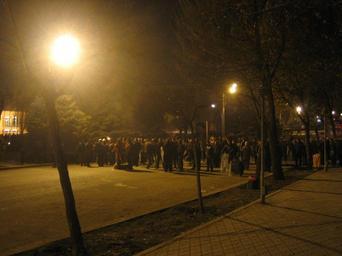 Keywords: Armenian Presidential Elections 2008 Protest Day 11 - 1205AM Activist Frontlines.jpg The 11th day of Armenian presidential election protests At 7 30 am the peaceful camp-in protest at Liberty Square in Yerevan was violently ended by Armenian special forces which used truncheons and electric shock devices to disperse the crowd of around 1 000 At 12 30 pm a new crowd marches to the French Embassy in a spontaneous demonstration barricade themselves using abandoned police buses and grow in number to around 150 000 By 12 am about 2 000 demonstrators are left barricaded <br/><br/>This picture 12 am shows the activist front lines about 500ft southwest of the police front lines at Shahumyan Square Note the riot shields confiscated from police and the police bus barricade in the background right Activists hold long metal rods and have some Molotov cocktails ready No firearms or grenades were seen despite government reports Own 2008-03-02 Serouj 40 10 32 19 N 44 30 25 61 E Demonstrations and protests relating to the Armenian presidential elections 2008 |