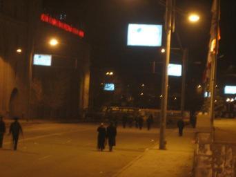 Keywords: Armenian Presidential Elections 2008 Protest Day 11 - 1232AM Miasnikyan Square - second western barricade.jpg The 11th day of Armenian presidential election protests At 7 30 am the peaceful camp-in protest at Liberty Square in Yerevan was violently ended by Armenian special forces which used truncheons and electric shock devices to disperse the crowd of around 1 000 At 12 30 pm a new crowd marches to the French Embassy in a spontaneous demonstration barricade themselves using abandoned police buses and grow in number to around 150 000 By 12 am the bulk of the approximately 2 000 demonstrators left in the area are at Miasnikyan Square in front of the French Embassy while only tens of people are at the site of the looting of a grocery store near the intersection of Mashdots Ave and G Lusavorich Street a quarter mile northwest of the location of this camera The nearest police are stationed at Shahuman Square 1/3 of a kilometer northeast of the location of this camera Police allow looting to continue in the area of Mashdots Ave and G Lusavorich for several hours as government TV crews film tens of people looting the grocery store <br/><br/>In this picture 12 32 AM the outer second layer of the western barricade beyond Hotel Metropole at Haghtanak Bridge Riot police transport buses have been used as a barricade 415 meters west of Miasnikyan Statue This front did not see clashes with police so buses have not been set ablaze nor destroyed here Own 2008-03-02 Serouj 40 10 26 47 N 44 30 10 78 E Demonstrations and protests relating to the Armenian presidential elections 2008 |