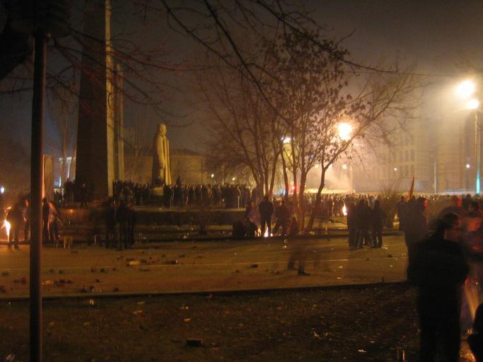 Keywords: Armenian Presidential Elections 2008 Protest Day 11 - 1240AM Miasnikyan Square - rocks and statue2.jpg The 11th day of Armenian presidential election protests At 7 30 am the peaceful camp-in protest at Liberty Square in Yerevan was violently ended by Armenian special forces which used truncheons and electric shock devices to disperse the crowd of around 1 000 At 12 30 pm a new crowd marches to the French Embassy in a spontaneous demonstration barricade themselves using abandoned police buses and grow in number to around 150 000 By 12 am the bulk of the approximately 2 000 demonstrators left in the area are at Miasnikyan Square in front of the French Embassy while only tens of people are at the site of the looting of a grocery store near the intersection of Mashdots Ave and G Lusavorich Street a quarter mile northwest of the location of this camera The nearest police are stationed at Shahuman Square 1/3 of a kilometer northeast of the location of this camera Police allow looting to continue in the area of Mashdots Ave and G Lusavorich for several hours as government TV crews film tens of people looting the grocery store <br/><br/>In this picture 12 40 AM the heart of the demonstration at Miasnikyan Square The platform where organizers speak using loudspeakers is in front of statue Rocks in the foreground are placed for use in case of another police attack Own 2008-03-02 Serouj 40 10 29 99 N 44 30 20 42 E Demonstrations and protests relating to the Armenian presidential elections 2008 Statues in Yerevan |
