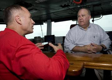 Keywords: Army Under Secretary embarks to help inter-Service cooperation on USS Truman 120902-N-MY642-067.jpg en Capt S Robert Roth commanding officer of USS Harry S Truman CVN 75 speaks with Under Secretary of the U S Army Joseph W Westphal on the ship's bridge as Dr Westphal participates in the U S Navy's Sea Embark outreach program Sept 2 2012 on the Atlantic Ocean Under Secretary Westphal is participating in the Navy's longstanding outreach program to promote inter-service cooperation in support of Joint Vision 2020 and gain an appreciation for Naval capabilities at sea The Navy's Sea Embark outreach program enables government and civilian senior leaders the ability to experience first-hand how the Navy contributes to the national defense strategy and to the stability of the global community U S Navy photo by Mass Communication Specialist 3rd Class Donald R White Jr /Released <br>Unit Under Secretary of the Army 2012-09-02 Seaman Donald R White https //www dvidshub net/image/656976/army-under-secretary-embarks-help-inter-service-cooperation-uss-truman 120902-N-MY642-067 2012-09-03 02 30 USS HARRY S TRUMAN CVN 75 US PD-USGov-Military-Navy Joseph Westphal USS Harry S Truman CVN-75 Images from DoD uploaded by Fæ |