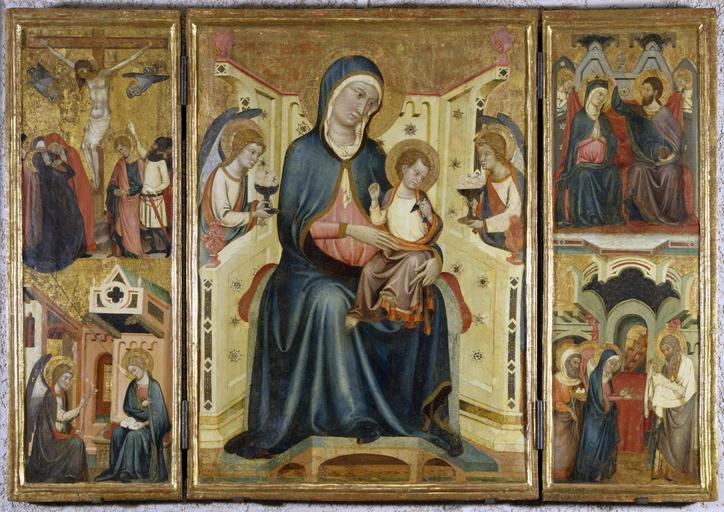 Keywords: Arnau Bassa - Triptych with Madonna and Child with the Crucifixion and the Annunciation - Walters 37468.jpg circle of The central scene of this altarpiece depicts the enthroned Madonna and Child flanked by angels The Christ Child holds a tiny European goldfinch a symbol of his resurrection The bird is tethered a reminder that in the 14th century such animals were kept as pets by children Angels present Mary with chalices of white flowers alluding to her purity On the left appear the Annunciation and the Crucifixion while Christ's Presentation in the Temple and the Coronation of the Virgin are on the right The delicate punch-work decoration and the slender graceful figures reveal the influence of Sienese painting Catalan artists learned the style and techniques of Italian painting by examining imported Italian works in local churches; some even traveled to Italy to perfect their craft ca 1340 1348 Medieval tempera and gold leaf on panel cm 126 8 184 9 accession number 37 468 1582 Henry Walters Baltimore 1931 mode of acquisition unknown Walters Art Museum Henry Walters Acquired by Henry Walters 1931 The International Style The Arts in Europe Around 1400 The Walters Art Gallery Baltimore 1962 place of origin Catalonia Spain Walters Art Museum license 2D Triptych with Madonna and Child with the Crucifixion and the Annunciation Media contributed by the Walters Art Museum needs category review Madonna and Child |