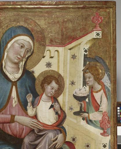 Keywords: Arnau Bassa - Triptych with Madonna and Child with the Crucifixion and the Annunciation - Walters 37468 - A T Detail B.jpg Circle of The central scene of this altarpiece depicts the enthroned Madonna and Child flanked by angels The Christ Child holds a tiny European goldfinch a symbol of his resurrection The bird is tethered a reminder that in the 14th century such animals were kept as pets by children Angels present Mary with chalices of white flowers alluding to her purity On the left appear the Annunciation and the Crucifixion while Christ's Presentation in the Temple and the Coronation of the Virgin are on the right The delicate punch-work decoration and the slender graceful figures reveal the influence of Sienese painting Catalan artists learned the style and techniques of Italian painting by examining imported Italian works in local churches; some even traveled to Italy to perfect their craft ca 1340 1348 Medieval tempera and gold leaf on panel cm 126 8 184 9 accession number 37 468 1582 Henry Walters Baltimore 1931 mode of acquisition unknown Walters Art Museum Henry Walters Acquired by Henry Walters 1931 The International Style The Arts in Europe Around 1400 The Walters Art Gallery Baltimore 1962 place of origin Catalonia Spain Walters Art Museum license 2D Triptych with Madonna and Child with the Crucifixion and the Annunciation Media contributed by the Walters Art Museum needs category review |