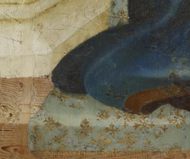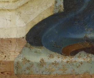Keywords: Arnau Bassa - Triptych with Madonna and Child with the Crucifixion and the Annunciation - Walters 37468 - A T Detail O.jpg Circle of The central scene of this altarpiece depicts the enthroned Madonna and Child flanked by angels The Christ Child holds a tiny European goldfinch a symbol of his resurrection The bird is tethered a reminder that in the 14th century such animals were kept as pets by children Angels present Mary with chalices of white flowers alluding to her purity On the left appear the Annunciation and the Crucifixion while Christ's Presentation in the Temple and the Coronation of the Virgin are on the right The delicate punch-work decoration and the slender graceful figures reveal the influence of Sienese painting Catalan artists learned the style and techniques of Italian painting by examining imported Italian works in local churches; some even traveled to Italy to perfect their craft ca 1340 1348 Medieval tempera and gold leaf on panel cm 126 8 184 9 accession number 37 468 1582 Henry Walters Baltimore 1931 mode of acquisition unknown Walters Art Museum Henry Walters Acquired by Henry Walters 1931 The International Style The Arts in Europe Around 1400 The Walters Art Gallery Baltimore 1962 place of origin Catalonia Spain Walters Art Museum license 2D Triptych with Madonna and Child with the Crucifixion and the Annunciation Media contributed by the Walters Art Museum needs category review |