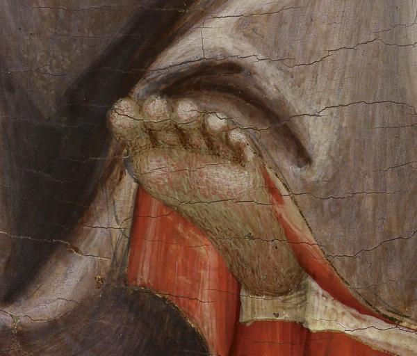 Keywords: Arnau Bassa - Triptych with Madonna and Child with the Crucifixion and the Annunciation - Walters 37468 - A T Detail P.jpg Circle of The central scene of this altarpiece depicts the enthroned Madonna and Child flanked by angels The Christ Child holds a tiny European goldfinch a symbol of his resurrection The bird is tethered a reminder that in the 14th century such animals were kept as pets by children Angels present Mary with chalices of white flowers alluding to her purity On the left appear the Annunciation and the Crucifixion while Christ's Presentation in the Temple and the Coronation of the Virgin are on the right The delicate punch-work decoration and the slender graceful figures reveal the influence of Sienese painting Catalan artists learned the style and techniques of Italian painting by examining imported Italian works in local churches; some even traveled to Italy to perfect their craft ca 1340 1348 Medieval tempera and gold leaf on panel cm 126 8 184 9 accession number 37 468 1582 Henry Walters Baltimore 1931 mode of acquisition unknown Walters Art Museum Henry Walters Acquired by Henry Walters 1931 The International Style The Arts in Europe Around 1400 The Walters Art Gallery Baltimore 1962 place of origin Catalonia Spain Walters Art Museum license 2D Triptych with Madonna and Child with the Crucifixion and the Annunciation Media contributed by the Walters Art Museum needs category review |