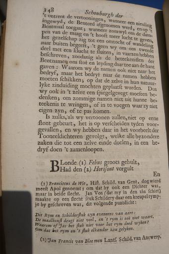 | Keywords: Arnold Houbraken VII p 348.JPG en Copy of Arnold Houbraken's Schouburg from 1719 published and sold by the author nl 't ontrent de vertooningen wanneer een nieuwling ingewyd de Benteed afgenomen werd en op 't Bentmaal toegaat; wanneer somwyl om de dampen van de maag en 't hoofd meer lugt te geven het gezelschap zig tot een omtogt of wandeling naar buiten begeeft 't geen wy om ons tweede Deel met een klugt te sluiten in vaerzen hebben beschreven zoodanig als de beteekenissen der Bentnamen ons stof en leiding daar toe aan de hand gaven Waarom wy de namen ook niet naar het bedryf maar het bedryf naar de namen hebben moeten schikken; op dat de zelve in hun natuurlyke zinduiding mogten geplaatst worden Dus wy ook in 't zelve een spiegelgevegt moesten bedenken; om sommige namen niet uit hunne beteekenis te wringen of in te voegen waar zy niet eigen zyn of te pas komen Is zulks als wy vertoonen zullen niet op eene stont gebeurt het is op verscheiden tyden voorgevallen en wy hebben daar in het voorbeeld der Toneeldichteren gevolgt welke alle byzondere zaken die tot een zelve einde doelen in een bedryf doen t' zamenloopen BLonde 1 Febus groots gehult BHad den 2 Horisont vergult 1 Franciscus de Wit Hist Schild van Gent dog wierd meest Apol genoemt; om dat hy ook een Dichter was maar in beide slegt Jan Vos dat my in den zin schiet maakte op een slegt stuk Schildery daar een kreupel rympje by geschreven was dit volgende puntdicht Dit Rym en Schilderstuk zyn eveneens van aart De maalkonst deugt niet veel en 't rym is ook niet waart Waarom of Jas het stuk niet voor het rym deed wyken Om dat het rym en 't stuk elkander zou gelyken 2 Jan Francis van Bloemen Lants Schild van Antwerp 2015-04-23 18 13 28 own PD-old-100 Jane023 other versions cc-0 Schouburg II Uploaded with UploadWizard Bentvueghels |