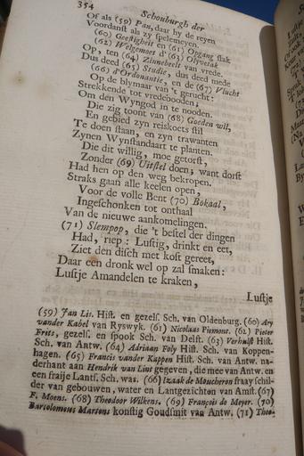 | Keywords: Arnold Houbraken VII p 354.JPG en Copy of Arnold Houbraken's Schouburg from 1719 published and sold by the author nl Of als 59 Pan daar hy de reyen Voordanst als zy spelemeyen 60 Geestigheid en 61 Opgang stak 62 Welgemoet d' 63 Olyvetak Op ten 64 Zinnebeeld van vrede Dus deed 65 Studie dus deed mede 66 d'Ordonantie en de 67 Vlucht Op de blymaar van 't gerucht Strekkende tot vredebooden; Om den Wyngod in te nooden Die zig toont van 68 Goeden wil En gebied zyn reiskoets stil Te doen staan en zyn trawanten Zynen Wynstandaart te planten Die dit willig moe getorst Zonder 69 Uitstel doen; want dorst Had hen op den weg bekropen Straks gaan alle keelen open Voor de volle Bent 70 Bokaal Ingeschonken tot onthaal Van de nieuwe aankomelingen 71 Slempop die 't bestel der dingen Had riep Lustig drinkt en eet Ziet den disch met kost gereet Daar een dronk wel op zal smaken Lustje Amandelen te kraken 59 Jan Lis Hist en gezels Sch van Oldenburg 60 Ary vander Kabel van Ryswyk 61 Nicolaas Piemont 62 Pieter Frits gezels en spook Sch van Delft 63 Verhulst Hist Sch van Antw 64 Adriaan Foly Hist Sch van Koppenhagen 65 Francis vander Kappen Hist Sch Van Antw naderhand aan Hendrik van Lint gegeven die meê van Antw en een fraaije Lants Sch was 66 Izaak de Moucheron fraai schilder van gebouwen Water en Lantgezichten van Amst 67 F Moens 68 Theodoor Wilkens 69 François de Meyer 70 Bartolomeus Martenskonstig Goudsmit van Antw 71 Theodoor Visser Landschapsch H Mommers van Haarlem 2015-04-23 17 46 15 own PD-old-100 Jane023 other versions cc-0 Schouburg II Uploaded with UploadWizard Bentvueghels ImageNote 1 763 108 276 118 2048 3072 2 Jan Lis ImageNoteEnd 1 ImageNote 2 671 205 353 87 2048 3072 2 Ary van der Cabel ImageNoteEnd 2 ImageNote 3 1239 302 251 102 2048 3072 2 Nicolaas Piemont ImageNoteEnd 3 ImageNote 4 937 353 307 123 2048 3072 2 Adriaen Foly ImageNoteEnd 4 ImageNote 5 850 425 261 77 2048 3072 2 Francis vander Kappen ImageNoteEnd 5 ImageNote 6 686 451 440 133 2048 3072 2 Izaak de Moucheron ImageNoteEnd 6 ImageNote 7 1444 573 205 92 2048 3072 2 F Moens ImageNoteEnd 7 ImageNote 8 1224 778 384 123 2048 3072 2 Theodoor Wilkens ImageNoteEnd 8 ImageNote 9 896 1060 287 133 2048 3072 2 Francois de Meyer ImageNoteEnd 9 ImageNote 10 1275 1311 302 128 2048 3072 2 Bartolomeus Martens ImageNoteEnd 10 ImageNote 11 563 1475 307 138 2048 3072 2 Theodoor Visscher ImageNoteEnd 11 |