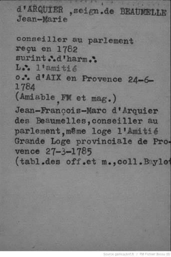 Keywords: Arquier, seign. de Beaumelle, Jean-Marie d'.jpg en File of Freemason Jean-François-Marie d ™Arquier 1761-1794 Scan from an original document fr Fiche du franc-maçon Jean-François-Marie d ™Arquier 1761-1794 Numérisation effectuée à partir d ™un document original http //archivesetmanuscrits bnf fr/ark /12148/cc96740x FM Fichier Bossu 8 BnF 2014 http //gallica bnf fr/ark /12148/btv1b10000007s/f142 image Scan from an original document Jean-François-Marie d ™Arquier 1761-1794 Masonic documents BnF |