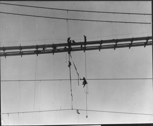 | Keywords: Arranging wind bracing for suspension bridge - NARA - 294023.tif Scope and content Photograph from Volume Two of a series of photo albums documenting the construction of the Grand Coulee Dam and related work on the Columbia Basin Project General notes 294023 Local identifier Department of the Interior Bureau of Reclamation Engineering and Research Center 05/18/1981 - 03/04/1988 NARA's Rocky Mountain Region Denver NRGA Building 48 Denver Federal Center West 6th Avenue and Kipling Street Denver CO 80225-0307 1935-09 Record group Record Group 115 Records of the Bureau of Reclamation 1889 - 2008 Record group ARC 444 Photograph albums compiled 1903 - 1972 Series ARC 293611 File unit File unit ARC Variant control numbers NAIL Control Number NRG-115-CONSTPHO85006-COLBASIN2730 yes Other versions <gallery> File Arranging wind bracing for suspension bridge - NARA - 294023 jpg jpg </gallery> NARA-cooperation PD-USGov Construction of the Grand Coulee Dam Men at work in the United States Suspension bridges in Washington state NARA TIF images with categorized JPGs |