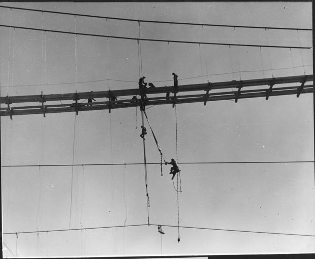 | Keywords: Arranging wind bracing for suspension bridge - NARA - 294023.jpg Scope and content Photograph from Volume Two of a series of photo albums documenting the construction of the Grand Coulee Dam and related work on the Columbia Basin Project General notes 294023 Local identifier Department of the Interior Bureau of Reclamation Engineering and Research Center 05/18/1981 - 03/04/1988 NARA's Rocky Mountain Region Denver NRGA Building 48 Denver Federal Center West 6th Avenue and Kipling Street Denver CO 80225-0307 1935-09 Record group Record Group 115 Records of the Bureau of Reclamation 1889 - 2008 Record group ARC 444 Photograph albums compiled 1903 - 1972 Series ARC 293611 File unit File unit ARC Variant control numbers NAIL Control Number NRG-115-CONSTPHO85006-COLBASIN2730 Other versions <gallery> File Arranging wind bracing for suspension bridge - NARA - 294023 tif tif </gallery> NARA-cooperation PD-USGov Construction of the Grand Coulee Dam Men at work in the United States Suspension bridges in Washington state |