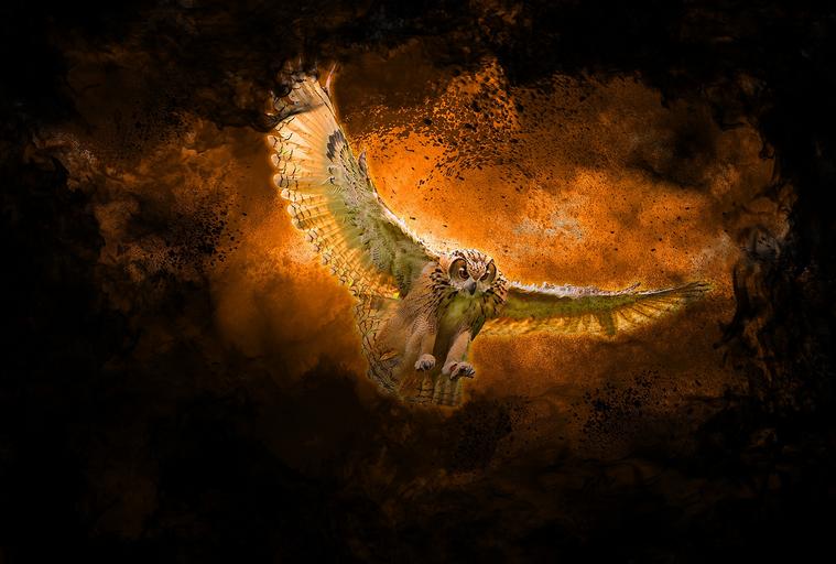 Keywords: art creative graphic arts owl bird of prey color creativity backdrop creative background idea style flight flying escape explosion smoke fire