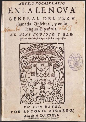 Keywords: Arte vocabulario lengua general Peru llamada Quichua 1586.jpg es Arte y vocabulario en la lengua general del Peru llamada Quichua y en la lengua Española Texto impreso el mas copioso y elegante que hasta agora se ha impresso - En los Reyes Lima por Antonio Ricardo 1586 - 184 40 h ; 8º Signatura R/9166 1586 http //bdh bne es/bnesearch/detalle/bdh0000063402 - Biblioteca Digital Hispánica Biblioteca Nacional de España Creator Unknown other versions BNE PD-old-100 Uploaded with UploadWizard Spanish language |