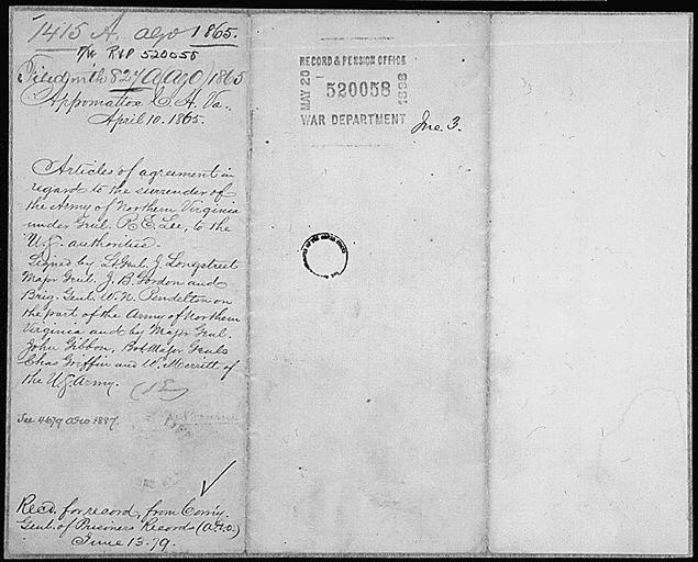 | Keywords: today's document todaysdocument u.s. national archives usnationalarchives april april 10, 1865 april101865 april 10 april10 04/10/1865 04101865 nara:arcid=300386 civil war civilwar army of northern virginia armyofnorthernvirginia surrender monochrome text blackandwhite writing photo border abstract texture black and white Title: Articles of Agreement Relating to the Surrender of the Army of Northern Virginia, April 10, 1865 Production Date: April 10, 1865 Articles of Agreement in Regard to the Surrender of the Army of Northern Virginia under Gen. Robert E. Lee, April 10, 1865; War Department, Record and Pension Office, 1892-1904; Records of the Adjutant General's Office, 1780s-1917; Record Group 94; National Archives. On April 9, 1865, Generals Ulysses S. Grant and Robert E. Lee met in the parlor of a house in Appomattox Court House, VA, to discuss this surrender of the Army of Northern Virginia, which would end the Civil War. According to the terms, the men of Lee's army could return home in safety if they pledged to end the fighting and deliver their arms to the Union Army. Persistent URL: arcweb.archives.gov/arc/action/ExternalIdSearch?id=300386 Access Restrictions: Unrestricted Use Restrictions: Unrestricted Title: Articles of Agreement Relating to the Surrender of the Army of Northern Virginia, April 10, 1865 Production Date: April 10, 1865 Articles of Agreement in Regard to the Surrender of the Army of Northern Virginia under Gen. Robert E. Lee, April 10, 1865; War Department, Record and Pension Office, 1892-1904; Records of the Adjutant General's Office, 1780s-1917; Record Group 94; National Archives. On April 9, 1865, Generals Ulysses S. Grant and Robert E. Lee met in the parlor of a house in Appomattox Court House, VA, to discuss this surrender of the Army of Northern Virginia, which would end the Civil War. According to the terms, the men of Lee's army could return home in safety if they pledged to end the fighting and deliver their arms to the Union Army. Persistent URL: arcweb.archives.gov/arc/action/ExternalIdSearch?id=300386 Access Restrictions: Unrestricted Use Restrictions: Unrestricted |