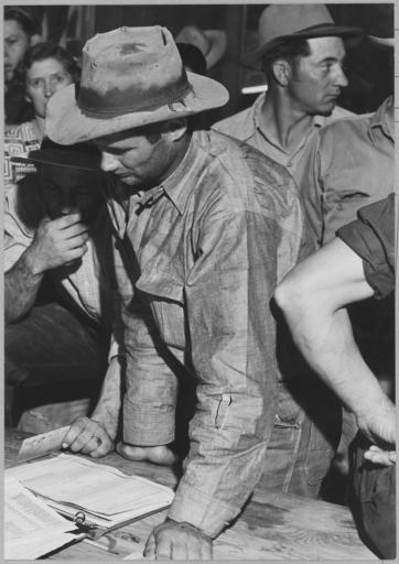 Keywords: Arvin, Kern County, California. ... Head of rural family asking questions regarding the size of his . . . - NARA - 521654.jpg Scope and content Full caption reads as follows Arvin Kern County California Head of rural family asking questions regarding the size of his relief check This is the first check which was received under the new state law of 58 maximum relief payment General notes 521654 Local identifier 83-G-41412A Department of Agriculture Bureau of Agricultural Economics Division of Economic Information ca 1922 - ca 1953 NARA-Author Lange Dorothea 1895-1965 Photographer 1372774 <br /> Still Picture Records Section Special Media Archives Services Division NWCS-S National Archives at College Park 8601 Adelphi Road College Park MD 20740-6001 1940-04-13 Record group Record Group 83 Records of the Bureau of Agricultural Economics 1876 - 1959 Record group ARC 412 Photographic Prints Documenting Programs and Activities of the Bureau of Agricultural Economics and Predecessor Agencies compiled ca 1922 - ca 1947 documenting the period ca 1911 - ca 1947 Series ARC 521048 File unit File unit ARC Variant control numbers NAIL Control Number NWDNS-83-G-41412A Other versions <gallery> File Arvin _Kern_County _California _ _Head_of_rural_family_asking_questions_regarding_the_size_of_his_ _ _ _-_NARA_-_521654 tif tif File Arvin _Kern_County _California _ _Head_of_rural_family_asking_questions_regarding_the_size_of_his_ _ _ _-_NARA_-_521654 jpg jpg </gallery> NARA-cooperation PD-USGov Dorothea Lange People of California Arvin California NARA images of Kern County California Black and white photographs of standing men Black and white photographs of California