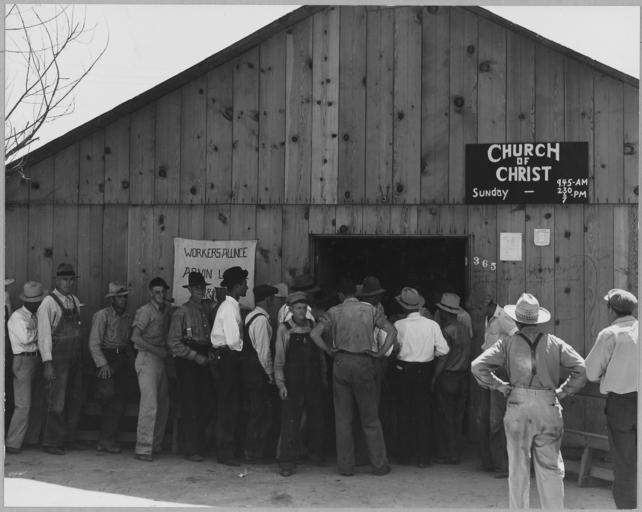 | Keywords: Arvin, Kern County, California. Line up for state relief pay day. Shows exterior of building. This b . . . - NARA - 521650.jpg  Scope and content Full caption reads as follows Arvin Kern County California Line up for state relief pay day Shows exterior of building This building is used for the worker's alliance meetings Church of Christ services and headquarters for distribution of S R A checks This is an area of rapidly growing shacktown communities most of the relief clients pictured here inhabit these new rural slums General notes 521650 Local identifier 83-G-41409A Department of Agriculture Bureau of Agricultural Economics Division of Economic Information ca 1922 - ca 1953 NARA-Author Lange Dorothea 1895-1965 Photographer 1372774 <br /> Still Picture Records Section Special Media Archives Services Division NWCS-S National Archives at College Park 8601 Adelphi Road College Park MD 20740-6001 1940-04-13 Record group Record Group 83 Records of the Bureau of Agricultural Economics 1876 - 1959 Record group ARC 412 Photographic Prints Documenting Programs and Activities of the Bureau of Agricultural Economics and Predecessor Agencies compiled ca 1922 - ca 1947 documenting the period ca 1911 - ca 1947 Series ARC 521048 File unit File unit ARC Variant control numbers NAIL Control Number NWDNS-83-G-41409A Other versions <gallery> File Arvin _Kern_County _California _Line_up_for_state_relief_pay_day _Shows_exterior_of_building _This_b_ _ _ _-_NARA_-_521650 tif tif File Arvin _Kern_County _California _Line_up_for_state_relief_pay_day _Shows_exterior_of_building _This_b_ _ _ _-_NARA_-_521650 jpg jpg </gallery> NARA-cooperation PD-USGov Dorothea Lange Arvin California Wooden churches in California Arvin 1940 in California NARA images of Kern County California Black and white photographs of California |
