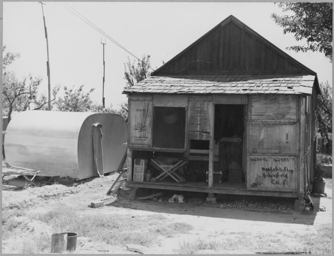 Keywords: Arvin, Kern County, California. One in a community of shacks in subdivided orchard rented to agricul . . . - NARA - 521661.jpg Scope and content Full caption reads as follows Arvin Kern County California One in a community of shacks in subdivided orchard rented to agricultural workers as permanent homes Workers on and off relief Shacks rent from 7 to 12 a month No running water Note trailer being built and potatoes stored under house Probably culls brought home from job in potato fields General notes 521661 Local identifier 83-G-41417 Department of Agriculture Bureau of Agricultural Economics Division of Economic Information ca 1922 - ca 1953 NARA-Author Lange Dorothea 1895-1965 Photographer 1372774 <br /> Still Picture Records Section Special Media Archives Services Division NWCS-S National Archives at College Park 8601 Adelphi Road College Park MD 20740-6001 1940-04-11 Record group Record Group 83 Records of the Bureau of Agricultural Economics 1876 - 1959 Record group ARC 412 Photographic Prints Documenting Programs and Activities of the Bureau of Agricultural Economics and Predecessor Agencies compiled ca 1922 - ca 1947 documenting the period ca 1911 - ca 1947 Series ARC 521048 File unit File unit ARC Variant control numbers NAIL Control Number NWDNS-83-G-41417 Other versions <gallery> File Arvin _Kern_County _California _One_in_a_community_of_shacks_in_subdivided_orchard_rented_to_agricul_ _ _ _-_NARA_-_521661 tif tif File Arvin _Kern_County _California _One_in_a_community_of_shacks_in_subdivided_orchard_rented_to_agricul_ _ _ _-_NARA_-_521661 jpg jpg </gallery> NARA-cooperation PD-USGov Dorothea Lange Wooden houses in Kern County California Porches in California Arvin California 1940 Travel trailers 1940 in California NARA images of Kern County California Black and white photographs of residential buildings Black and white photographs of California Shacks |