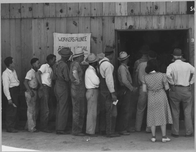 | Keywords: Arvin, Kern County, California. Line up for state relief pay day. Shows exterior of building. This b . . . - NARA - 521651.jpg Scope and content Full caption reads as follows Arvin Kern County California Line up for state relief pay day Shows exterior of building This building is used for the worker's alliance meetings Church of Christ services and headquarters for distribution of S R A checks This is an area of rapidly growing shacktown communities most of the relief clients pictured here inhabit these new rural slums General notes 521651 Local identifier 83-G-41409B Department of Agriculture Bureau of Agricultural Economics Division of Economic Information ca 1922 - ca 1953 NARA-Author Lange Dorothea 1895-1965 Photographer 1372774 <br /> Still Picture Records Section Special Media Archives Services Division NWCS-S National Archives at College Park 8601 Adelphi Road College Park MD 20740-6001 1940-04-13 Record group Record Group 83 Records of the Bureau of Agricultural Economics 1876 - 1959 Record group ARC 412 Photographic Prints Documenting Programs and Activities of the Bureau of Agricultural Economics and Predecessor Agencies compiled ca 1922 - ca 1947 documenting the period ca 1911 - ca 1947 Series ARC 521048 File unit File unit ARC Variant control numbers NAIL Control Number NWDNS-83-G-41409B Other versions <gallery> File Arvin _Kern_County _California _Line_up_for_state_relief_pay_day _Shows_exterior_of_building _This_b_ _ _ _-_NARA_-_521651 tif tif File Arvin _Kern_County _California _Line_up_for_state_relief_pay_day _Shows_exterior_of_building _This_b_ _ _ _-_NARA_-_521651 jpg jpg </gallery> NARA-cooperation PD-USGov Dorothea Lange People of California Arvin California 1940 in California NARA images of Kern County California Black and white photographs of standing men Arvin Black and white photographs of standing groups Arvin Black and white photographs of California |