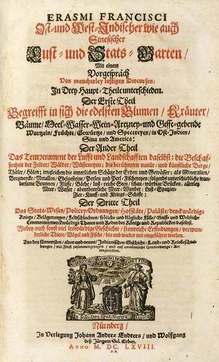 Keywords: As 41 franc 2.jpg Ost und West Indischer wie auch Sinesischer Luft und Staats Garten by Erasmus Finx The title reads <div style background-color EEE9BF > Mit einem Vorgespräch Von mancherley luftigen Discursen; In Drey Haupt Theile unterschieden Der Erste Theil Begreifft in sich die edelsten Blumen / Kräuter / Bäume / Wasser Wein Arzney und Gifft gebende Wurzeln / Früchte / Gewürze und Specereyen in Ost Indien / China und America; Der Ander Theil Das Temperament der Lufft und Landschafften daselbst; die Beschaffenheit der Felder/Wälder / Wüsteneyen; die berühmten natür und künstliche Berge / Thäler / Höhlen; imgleichen die innerlichen Schätze der Erden und Gewässer; als Mineralien/ Bergwercke / Metallen / Edelgesteine / Perlen und Perl Fischereyen; folgends unterschiedliche wundersame Brunnen / Flüsse / Bäche / luft reiche Seen / schau würdige Brücken; allerley Meer Wasser / abenteuerliche Meer Wunder; Luft Spatzier Zier Kauff und Kriegs Schiffe; Der Dritte Theil Das Staats Wesen / Polizey Ordnungen / / Paläste / denckwürdige Kriege / Belagerungen / Feldschlachten / fröliche und klägliche Fälle / Geists und Weltliche Ceremonien / merckwürdige Thaten und Reden der Könige und Republicken daselbst Wobey auch sonst viel leswürdige Geschichte / sinnreiche Erfindungen / verwunderliche Thiere / Vögel und Fische / hin und wieder mit eingeführet werden Aus den / alten und neuen / Indianischen Geschichte Land und Reisebeschreibungen / mit Fleiß zusammengezogen / und auf annehmliche Unterredungs Art eingerichtet </div> Source http //www kb dk/elib/mss/skatte/verden/billeder/as_41_franc_b2 htm This image is more than 70 years old PD-old Illustrated title pages from Germany Erasmus Francisci Uploads by Mattes from external sources Template artwork possible |