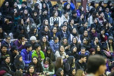 | Keywords: crowd people Este proceso se realizó en el contexto de una asamblea general a la que llamó la Mesa Ejecutiva de la Federación de Estudiantes de la UMAG (FEUM) y contó con una masiva asistencia de alumnos, quienes reunidos en el Gimnasio del campus central, emitieron su preferencia a favor o en contra de sumarse a esta movilización a la que ya se ha plegado más de una decena de universidades a lo largo del país. Este proceso se realizó en el contexto de una asamblea general a la que llamó la Mesa Ejecutiva de la Federación de Estudiantes de la UMAG (FEUM) y contó con una masiva asistencia de alumnos, quienes reunidos en el Gimnasio del campus central, emitieron su preferencia a favor o en contra de sumarse a esta movilización a la que ya se ha plegado más de una decena de universidades a lo largo del país. |